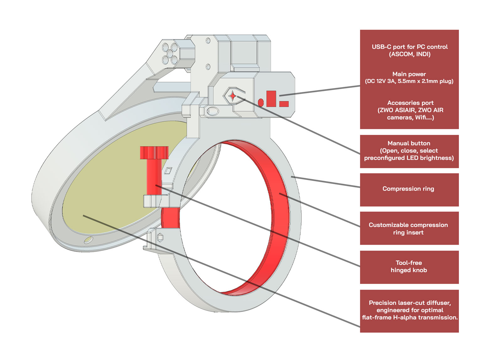 - Precision laser-cut diffuser, engineered to match the exact diameter for optimal flat-frame H-alpha transmission